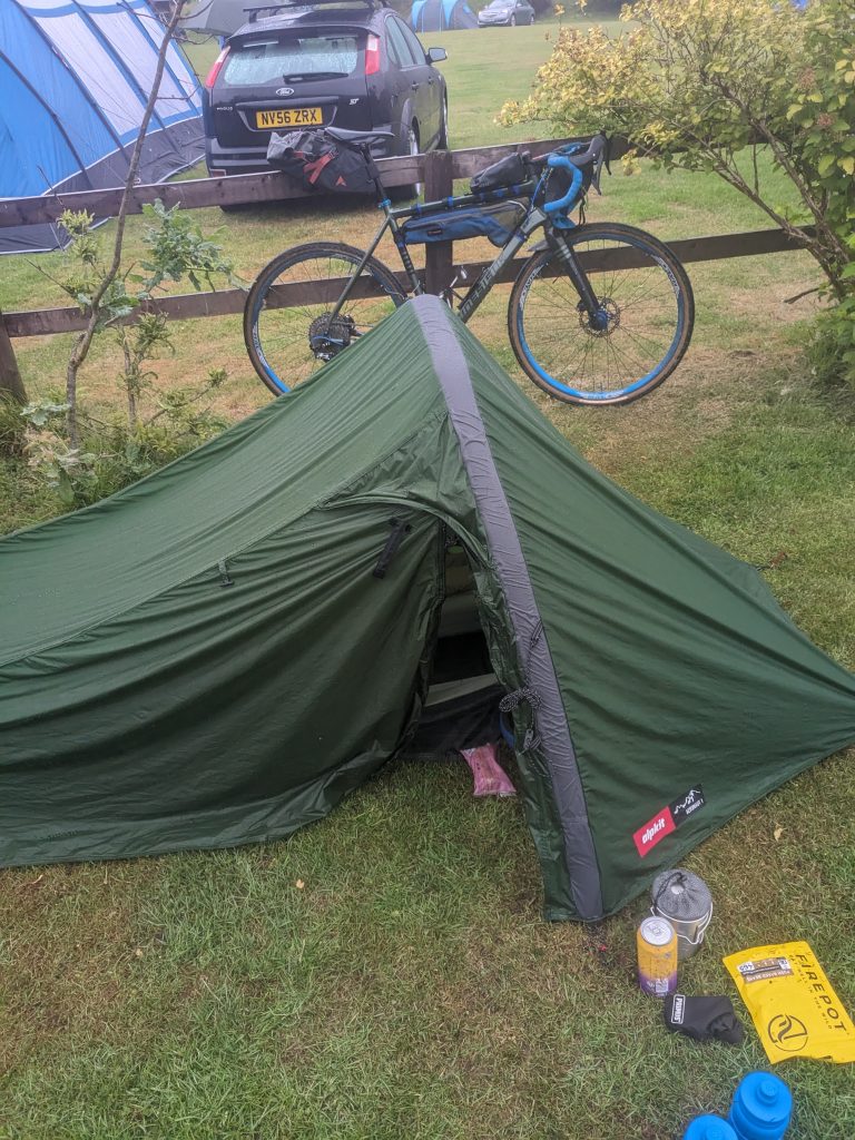 The tent is an Alpkit Aeronaut 1, and is inflatable, meaning not awkward poles to pack. It inflates from my bike pump, which is fine, but at the end of a long ride, it’s the thing I like the least about the tent. Otherwise, it’s light (1KG), roomy enough for a one person tent (read doesn’t feel like a coffin), warm, and has space for shoes, helmet, and cooking equipment in the “porch”.