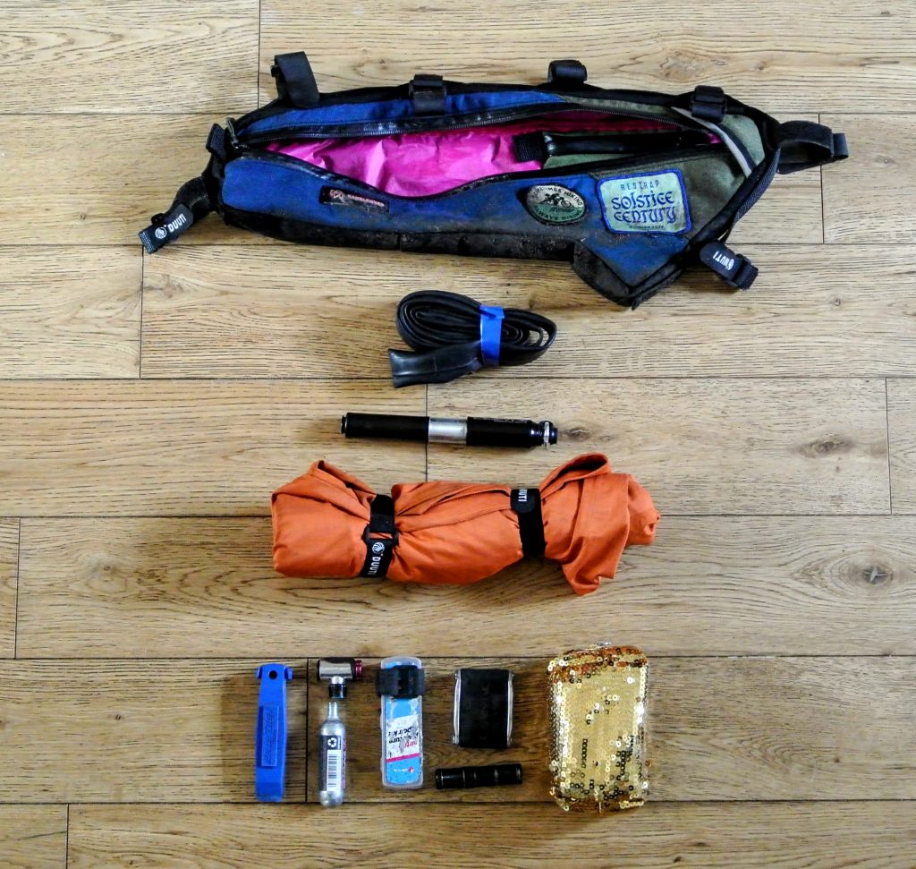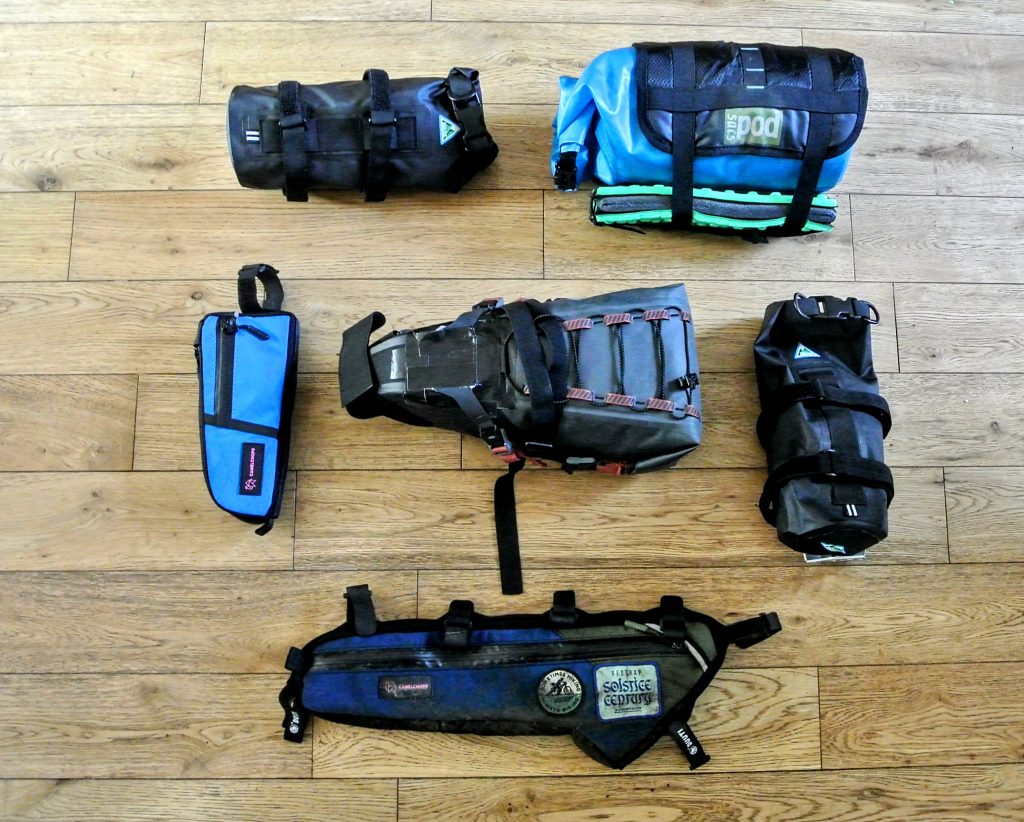 This is packed into a medium frame bag, a medium saddlebag, two small fork bags, a handlebar bag and a top tube bag.