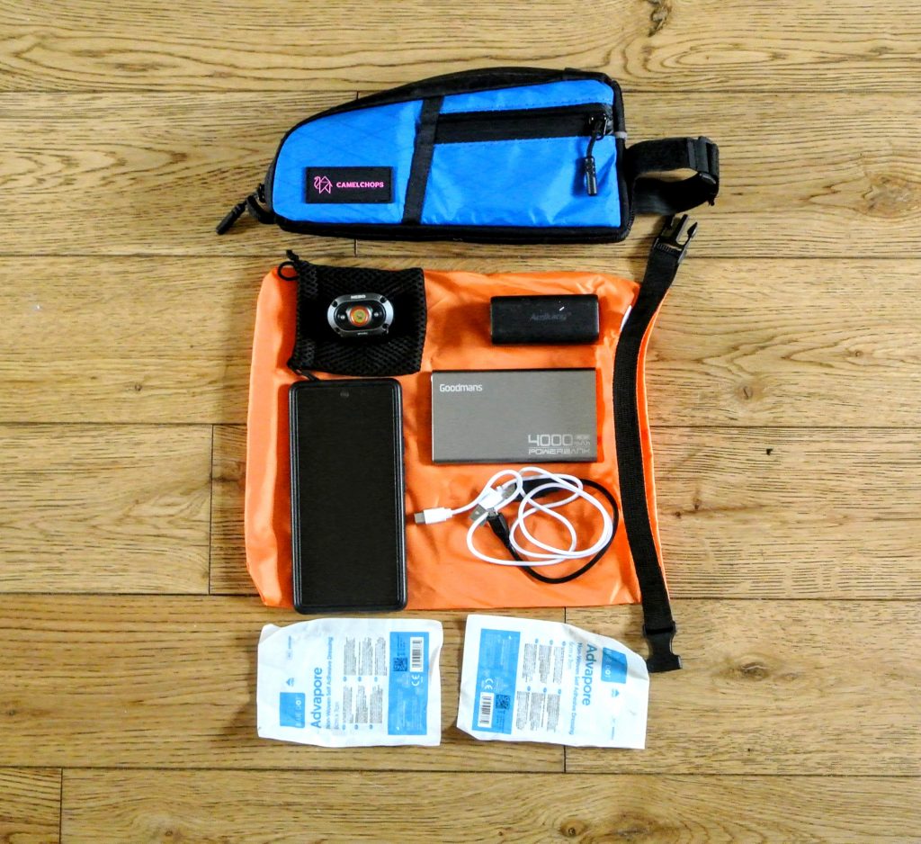 This one is waterproof, but as I stash my electronics in there, I’ve doubled up with a small dry bag. On longer trips, I’ve got a couple of power banks that I can charge my Garmin and lights from, and there’s a handy port in the bag that means I can charge my Garmin on the go, and stick my main light battery in too.