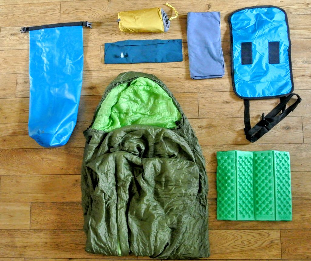 I can’t fault anything about this bag, it fits my sleeping bag (3 seasons, Aldi special buy), pillow (Decathlon) and sleeping mat (again, Decathlon), with loads of room spare for additional clothing needed for the trip. I also strap a little squishy foldable mat, which weighs next to nothing and offers a nice place to sit or kneel when cooking.