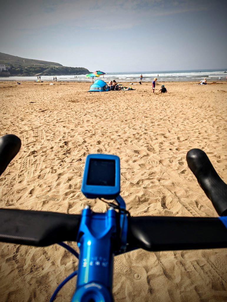 Bigbury Sands. There’s a pub called the Pilchard on the “island” in the top left of the photo. I did manage to ride to it, but it was hot and hard work.